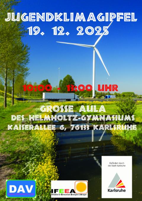 Am 19. Dezember 2025 findet der Jugendklimagipfel 2025 unter dem Motto „Zukunftskompetenzen für eine nachhaltige Generation“ in der Großen Aula des Helmholtz-Gymnasiums Karlsruhe statt. Von 10:00 bis 13:00 Uhr erwartet die Teilnehmenden ein vielseitiges Programm aus Fachvorträgen, Podiumsdiskussionen, Workshops und interaktiven Mitmach-Ateliers.