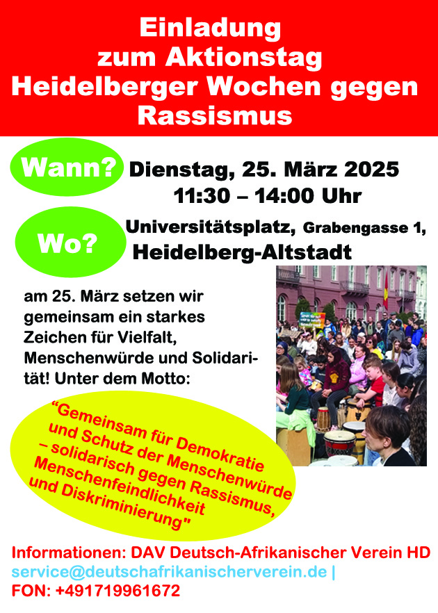 DAV Deutsch-Afrikanischer Verein Heidelberg im Welthaus Heidelberg Willy-Brandt-Platz 5 69115 Heidelberg Fon: 01719961672 E-Mail: info@dav-germany.de www.dav-germany.de