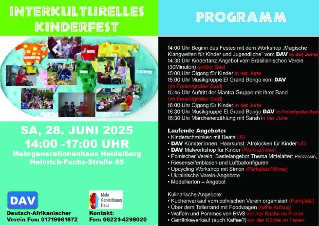 Veranstaltende: DAV- Deutsch-Afrikanischer Verein in Kooperation mit Kinder- u. Jugendtreff Hasenleiser. www.deutschafrikanischerverein.de, Fon: +49(0)1719961672
