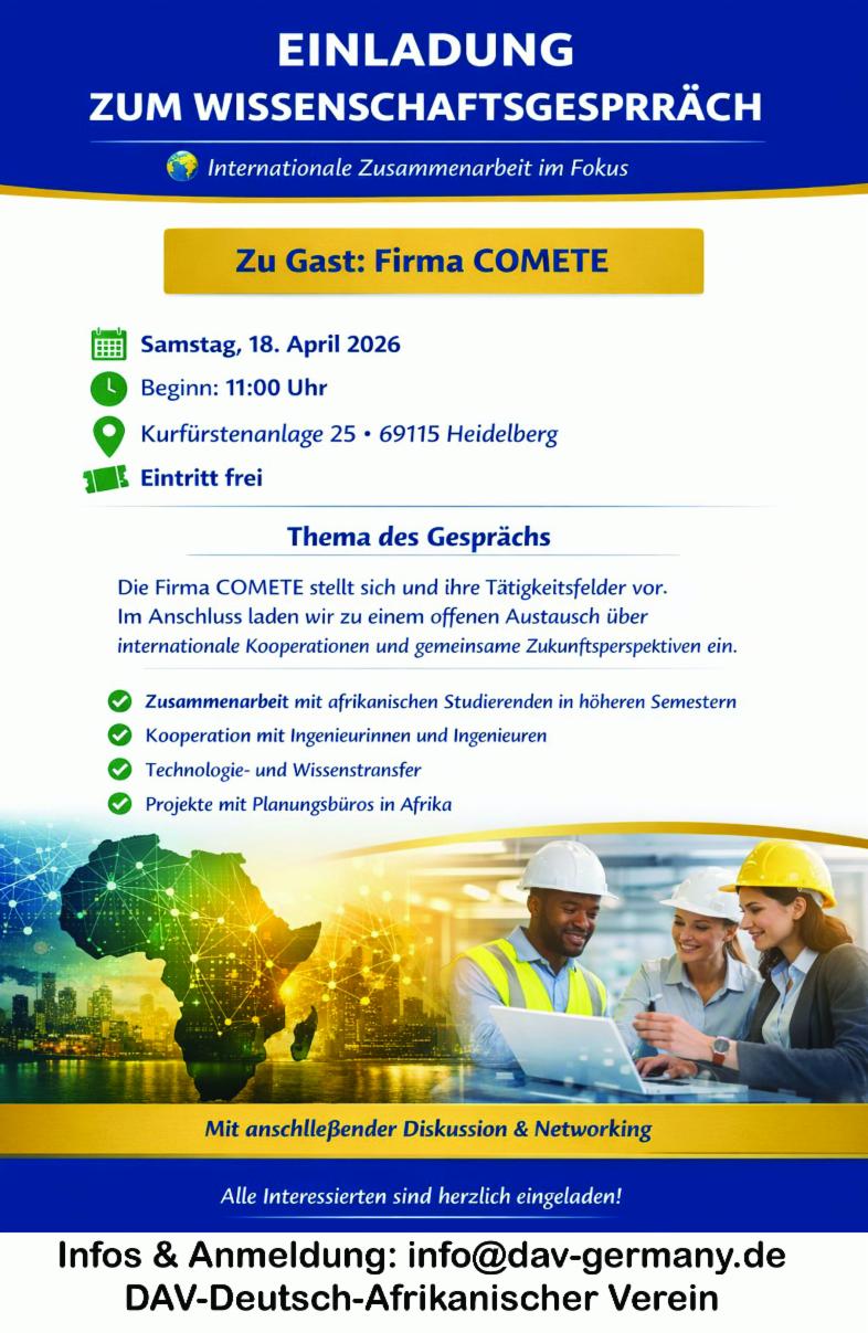 Im Mittelpunkt der Veranstaltung steht die Vorstellung der Firma COMETE sowie ihrer internationalen Tätigkeitsfelder. Im anschließenden gemeinsamen Austausch möchten wir zentrale Fragen und Perspektiven der internationalen Kooperation diskutieren, darunter: